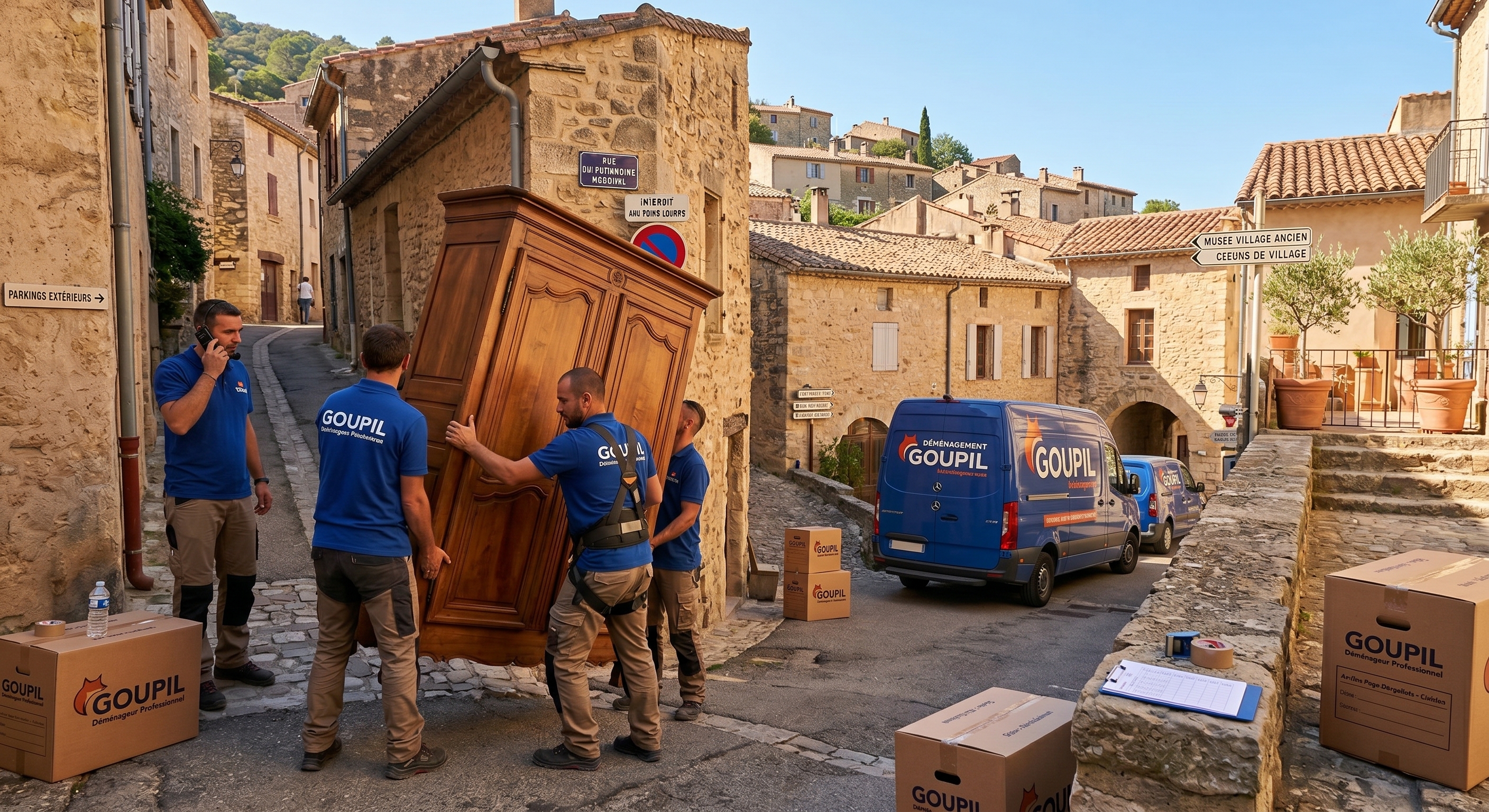 Pour les accès uniquement piétons (certaines ruelles de Saint-Guilhem-le-Désert ou Pézenas intra-muros), les équipes doivent porter les meubles sur 50 à 150 mètres. Cela impose du personnel supplémentaire (4 à 6 opérateurs au lieu de 3), des sangles professionnelles, des protections renforcées pour le mobilier et une organisation précise pour éviter les chocs dans les passages exigus.